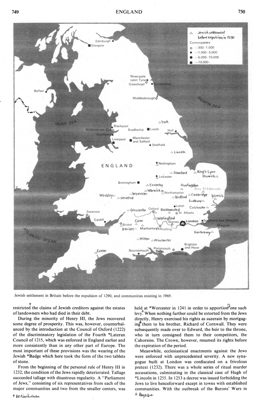 Encyclopaedia Judaica: Jews in England, vol.6, col. 749-750