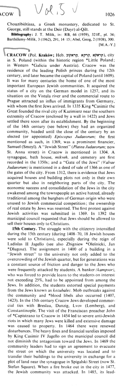 Encyclopaedia Judaica (1971): Cracow, vol. 5, col. 1026