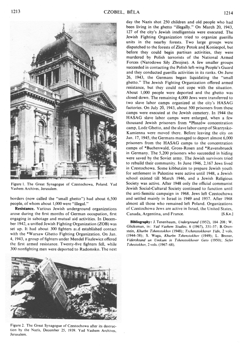 Encyclopaedia Judaica (1971): Czestochowa, vol. 5, col. 1213. The Great Synagogue of Czestocchowa