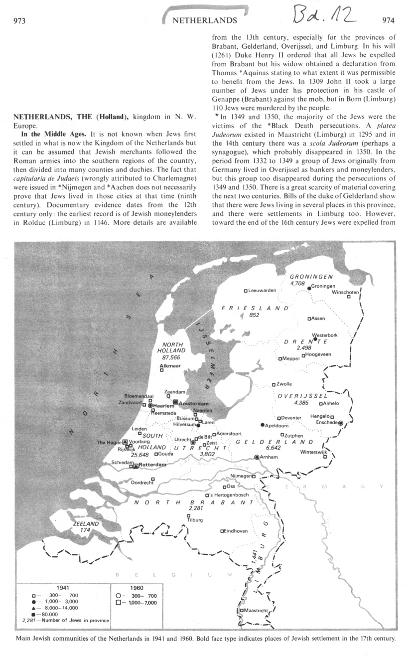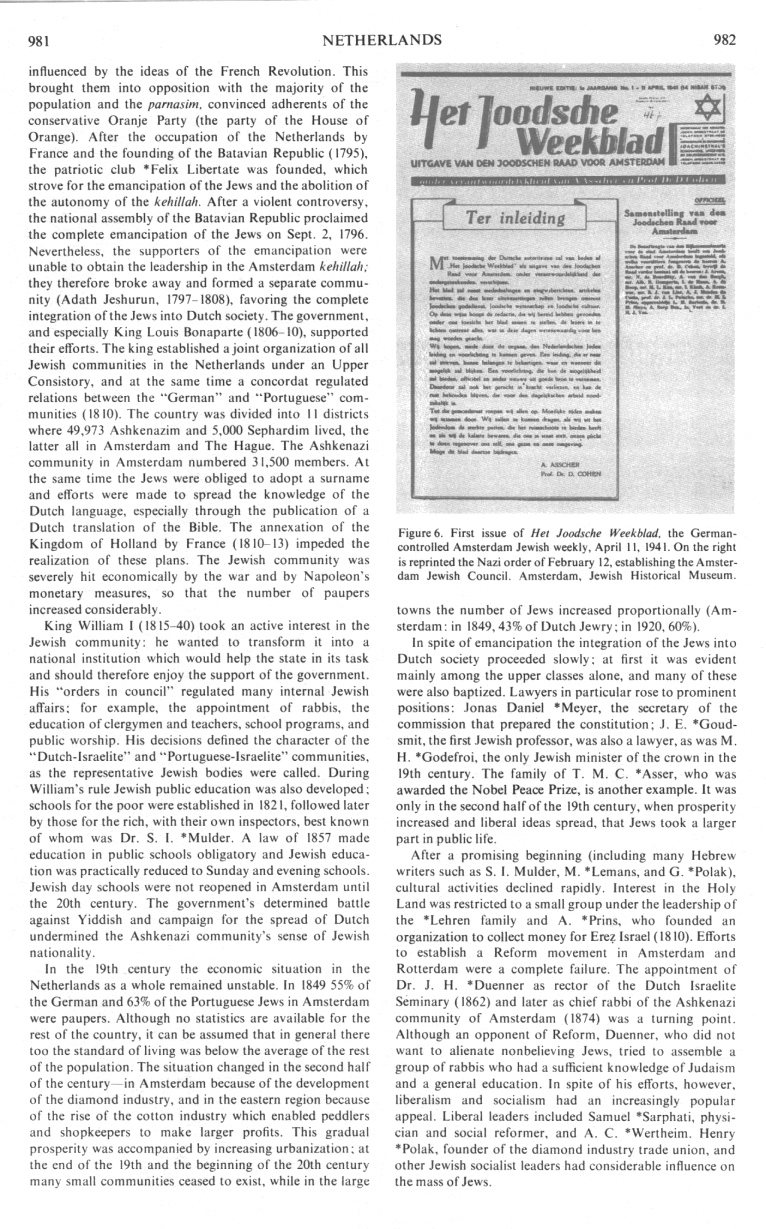 Until World War II there were four Jewish weeklies - of which the Nieuw Israëlitisch Weekblad (founded in 1865) and the Joodse Wachter (1905- ) were most widely read - and also many monthlies and magazines.> (col. 984)