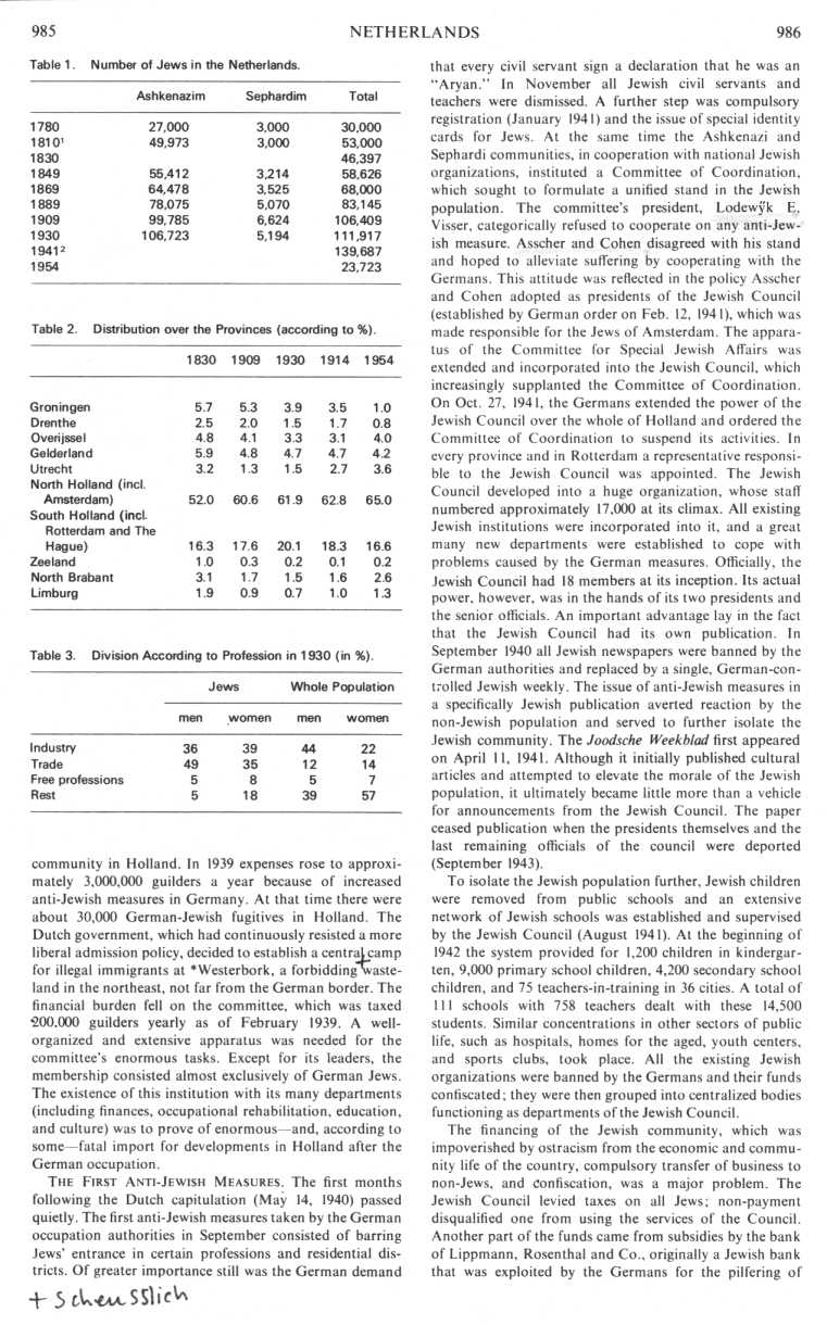In the first half of the 20th century, Jews also participated to a greater extent in Dutch society in many fields. As well as in the diamond industry, Jews were also represented in the textile industry, founding the large firms of Menko (Enschede), Spanjaard (Borne), and Kattenburg (Amsterdam), and the chain department stores of Bijenkorf and (col. 983)