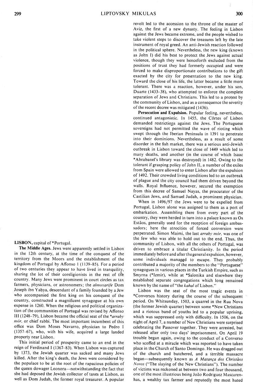 Encyclopaedia judaica: Jews in Lisbon, vol. 11, col. 301,