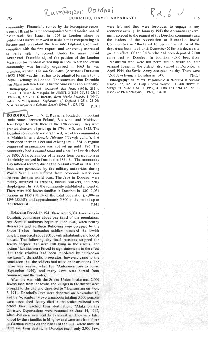 Encyclopaedia Judaica (1971): Jews in Dorohoi, vol.