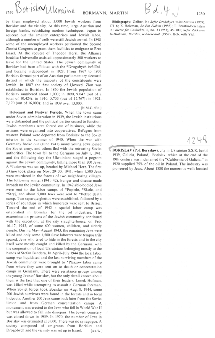 Encyclopaedia Judaica (1971): Jews in Borislav (Boryslav), vol. 4, col. 1248-1249-1250