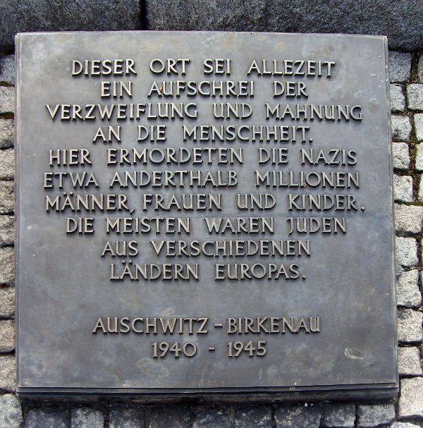 [7] Auschwitz-Gedenktafel von 1,5 Mio. Opfern, deutsch: Zusendung von Herrn Below
