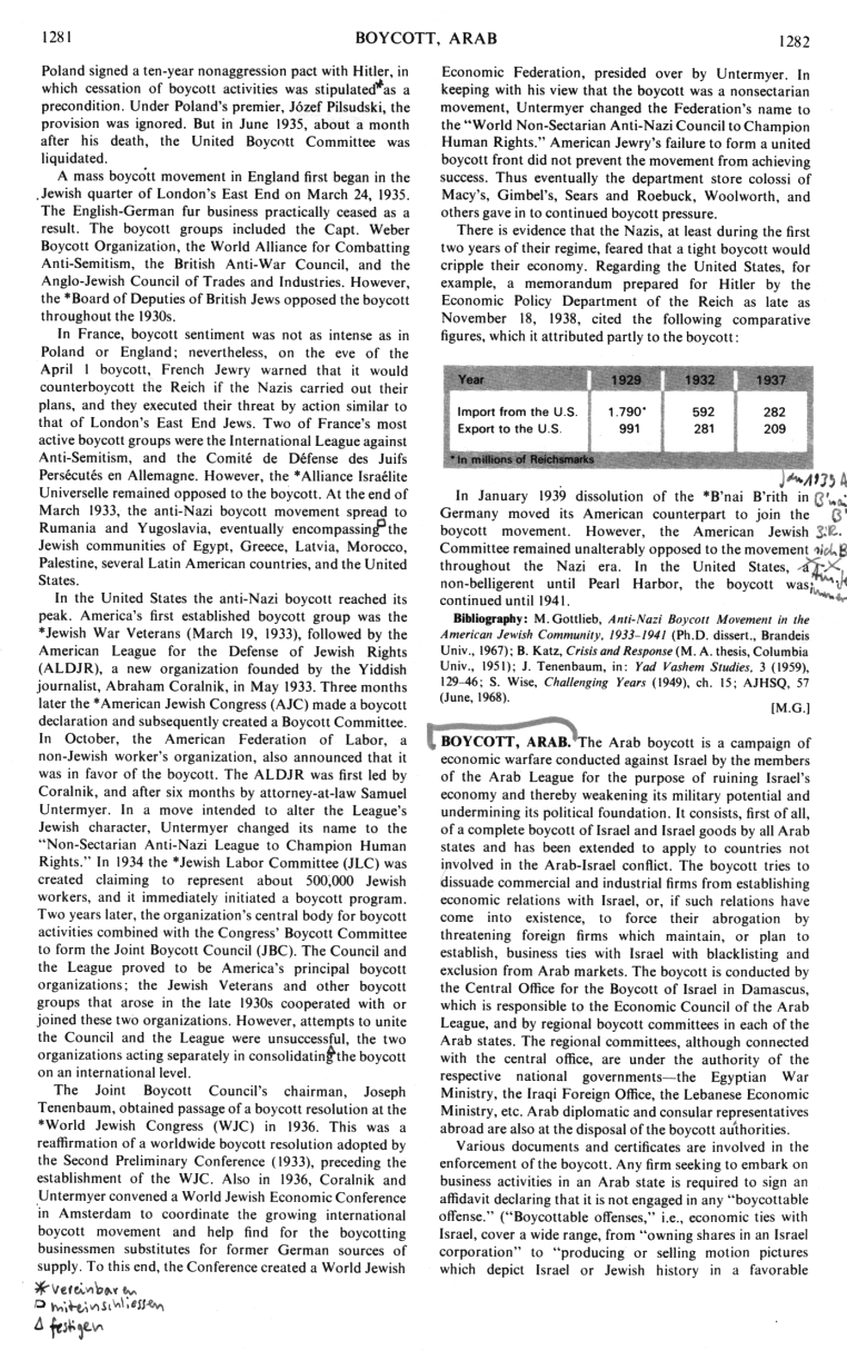 Encyclopaedia Judaica 1971: anti-Nazi boycott, vol. 4, col. 1281-1282
