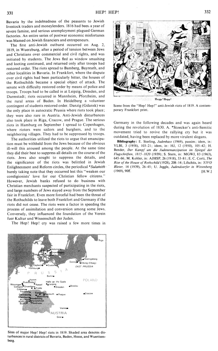 ![]() Encyclopaedia Judaica: Hep Hep pogroms, vol. 8, col. 330 |