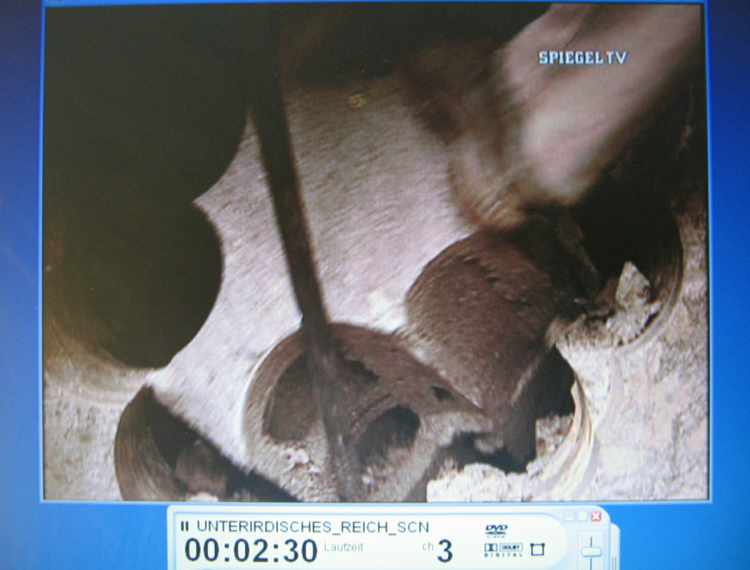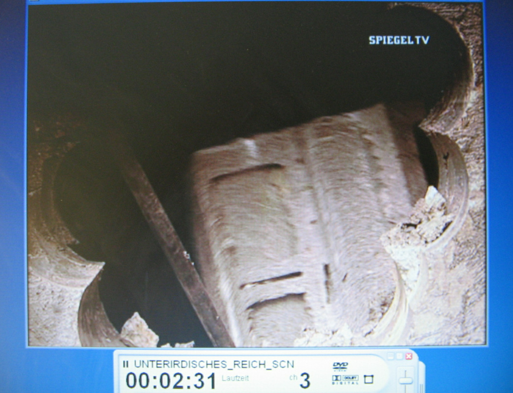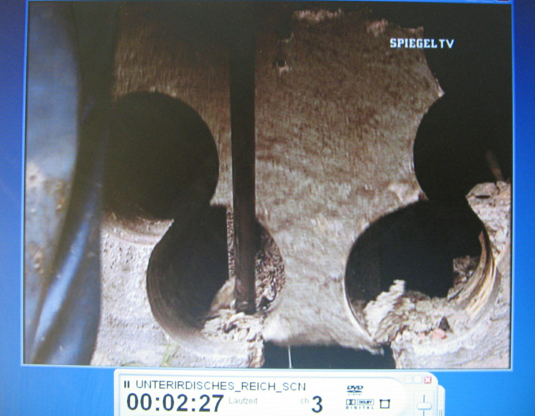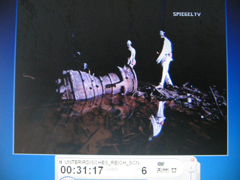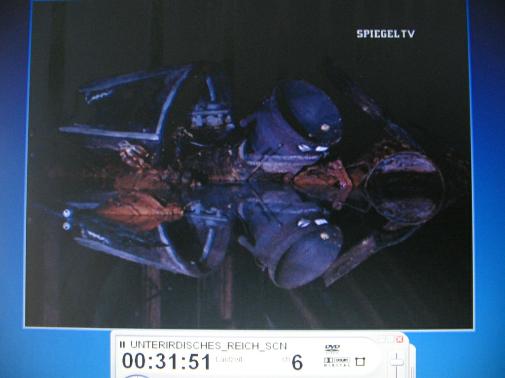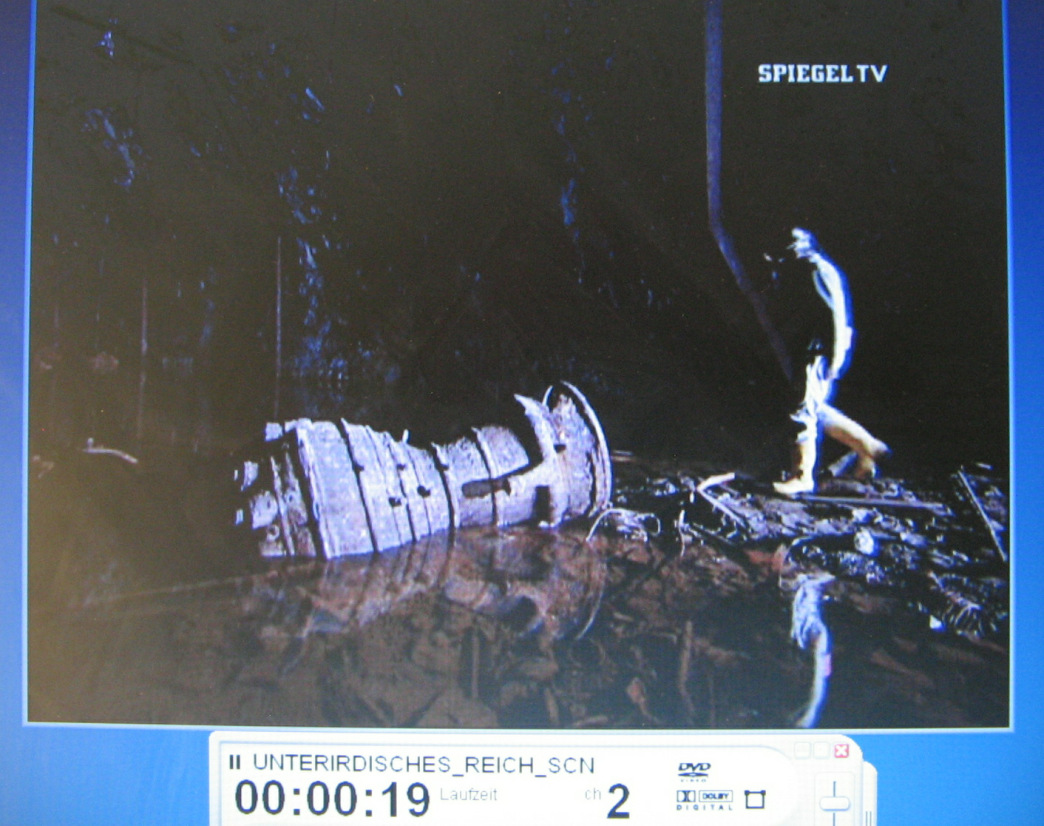 Es war eines der gigantischsten Bauvorhaben der Menschheitsgeschichte: Bombensichere Produktionsstätten für das Dritte Reich [Bild: Raketenrest im überschwemmten Stollen].