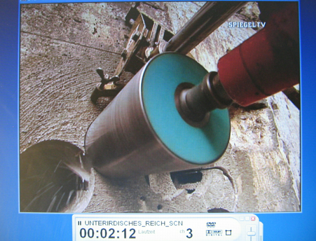 [Bild: Öffnung der Betonmauer vor dem Eingang mit Zylinderbohrungen im Kreis angeordnet, so dass am Ende ein grosses Stück herausfällt und ein Loch entsteht].