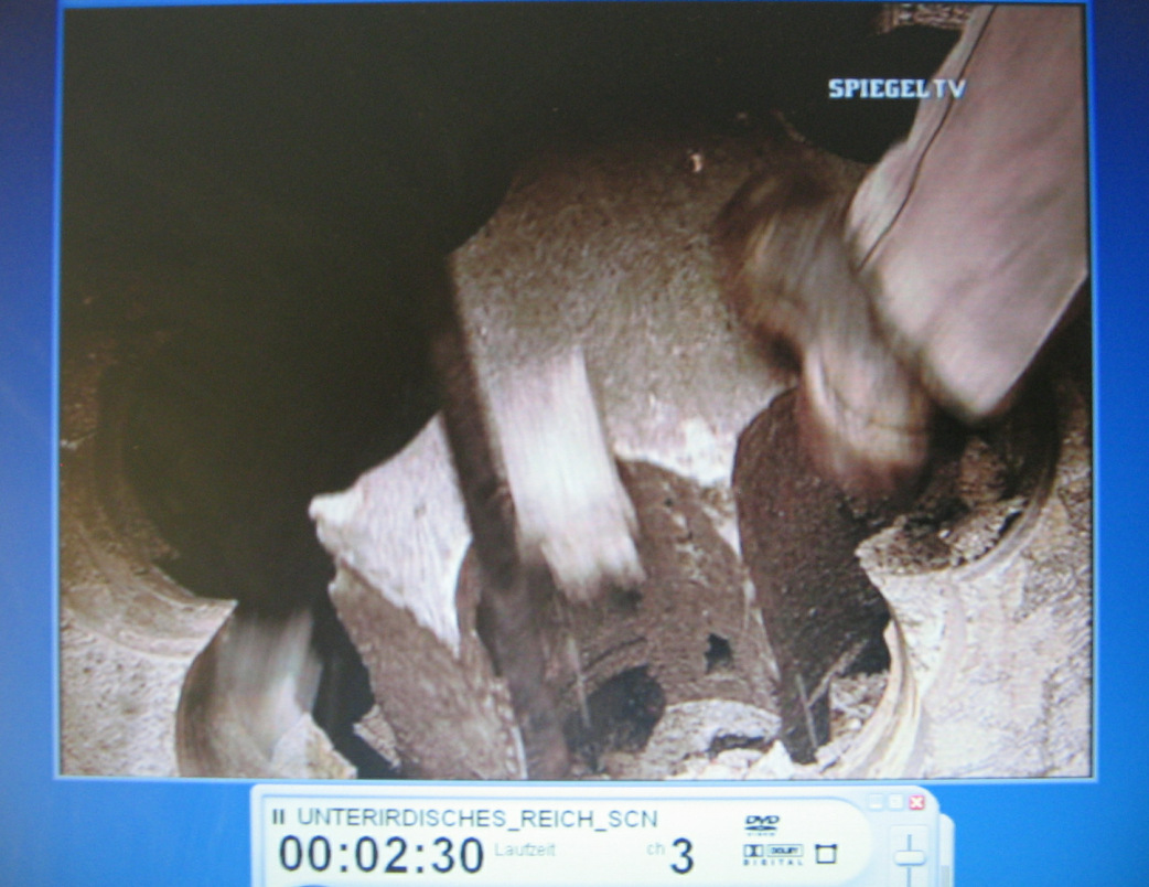 Bassin im Tunnelsystem mit Tunnelwärter Heinz RabeHunderttausende Sklavenarbeiter mussten das Werk für die Nazis vollbringen. Wie viele dabei ihr Leben liessen, ist ungewiss. Bis zum letzten Tag des Krieges wurde fieberhaft in den Tunneln gearbeitet [Bild: Tunnelarbeiter mit Pickel und Schaufel am Entfernen von Gestein in einem Stollen].