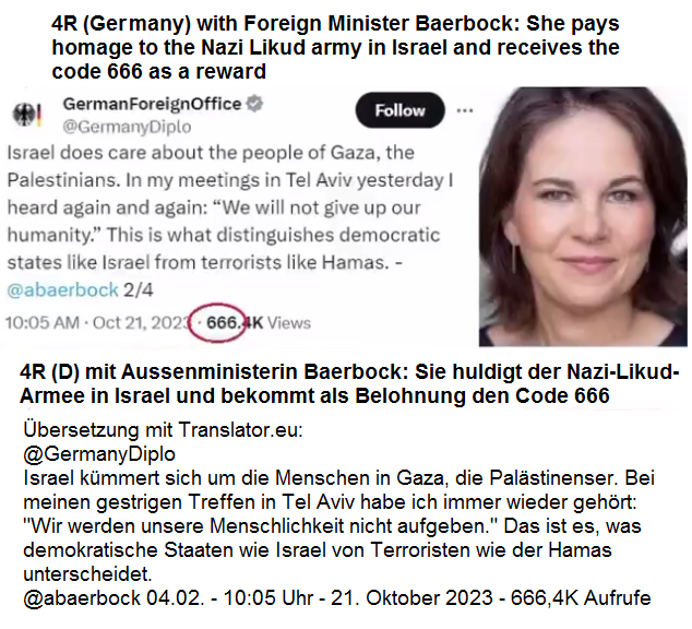 23.10.2023: Satanistin Baerbock (Code 666) behauptet, Israel