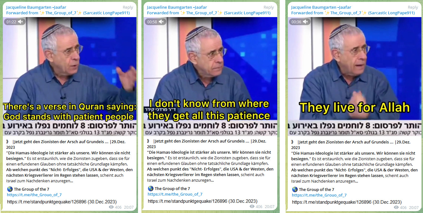 9.10.2023 alle Palästinenser als "menschliche Tiere" (Video-Link).