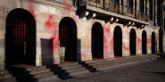 auf die Wand einer zerbombten Moschee und salutiert zum