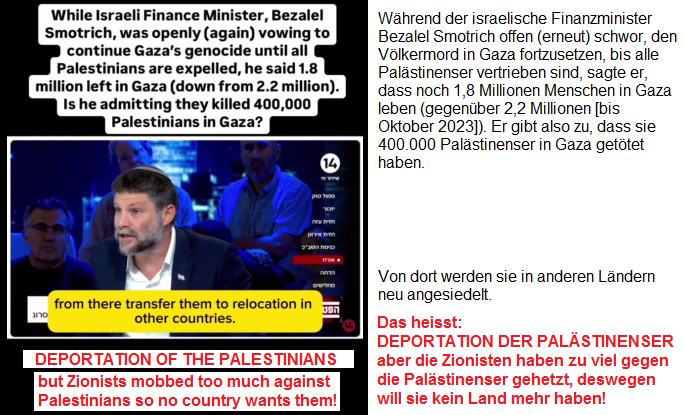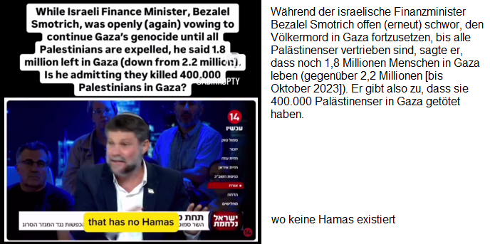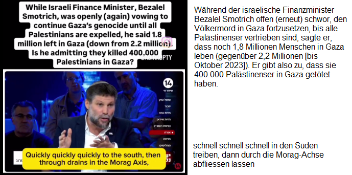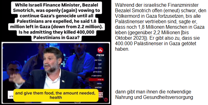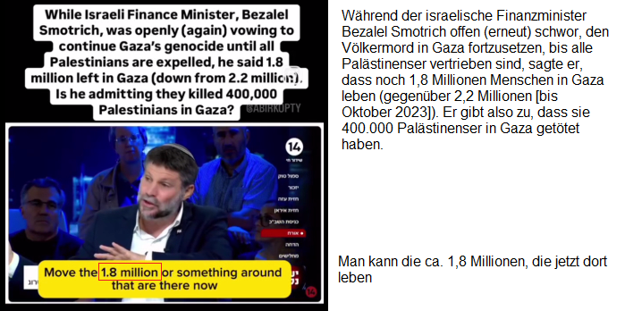 -- der Nazi-Zion-Finanzminister Smotrich verkündet, es leben noch 1,8 Millionen Palästinenser im Gazastreifen-KZ, wie die Zahl zustandekommt, ist ihm EGAL
