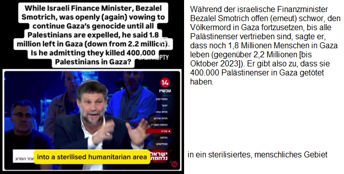 Der Nazi-Zionist Smotrich gibt für den Gazastreifen noch 1,8 Millionen PalästinenserInnen an - ohne das Wort "Völkermord" zu benutzen: