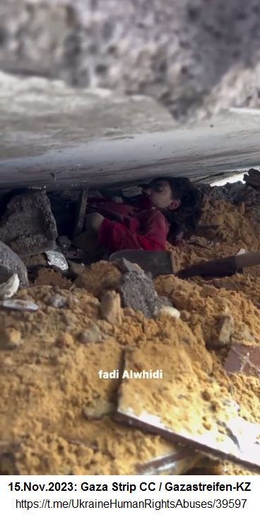 Die Grausamkeiten der kriminellsten Armee der Welt "Israel" sind unendlich, hier ein lebendes Kind unter einer Betonplatte (15.11.2023) [49], hier zwei aus Trümmern gerettete Kinder (15.11.2023) [Foto 50]