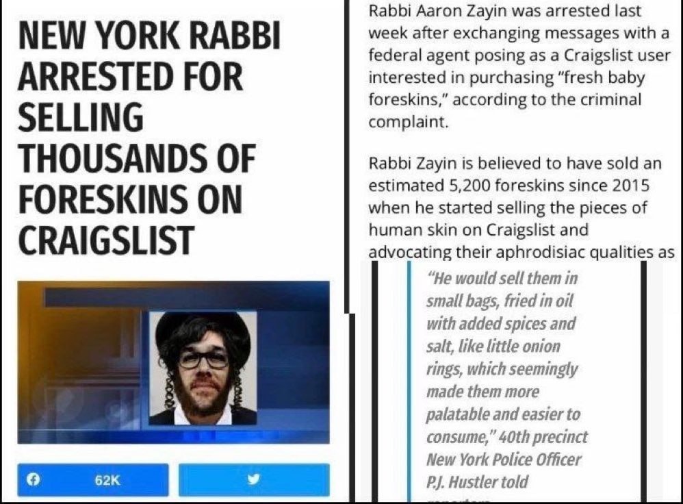 (ENGL orig.: New York rabbi arrested for selling thousands of foreskins on craigslist)https://www.newsbreak.com/new-york-city-ny/2180185556700-new-york-rabbi-arrested-for-selling-thousands-of-foreskins-on-craigslist9.5.2022: 17 kriminelle Rabbiner bekommen "Besuch" vom FBI mit Handschellen: Organhandel, Babyteile, Geldwäsche: