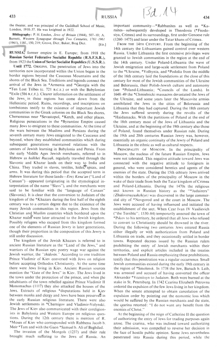 from: Russia; In: Encyclopaedia Judaica 1971, vol. 14