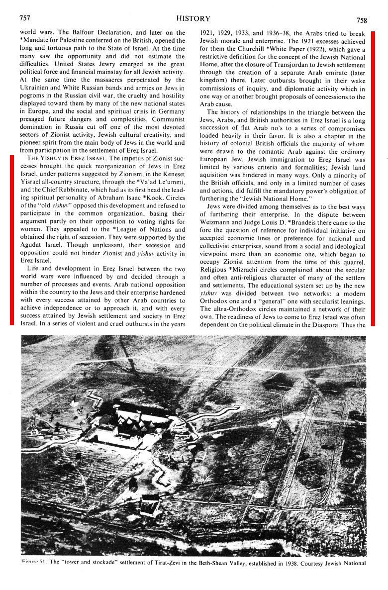 Encyclopaedia Judaica (1971): History, vol. 8, col. 757-758: The "tower and stockade" settlement of Tirat-Zevi in the Beth-Shean Valley, established in 1938. Courtesy Fantasy Jewish National Fund