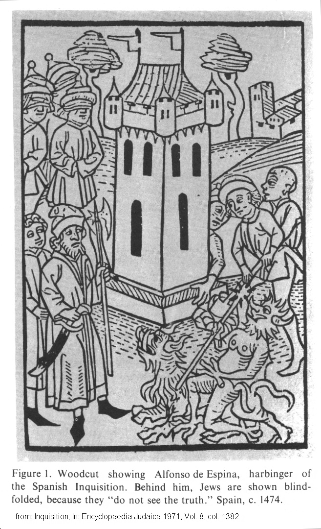 Woodcut about inquisitor Alfonso de Espina confronting with the devil, and Jews in the background are blindfolded, because they "do not see the truth", Spain, c. 1474 [1]